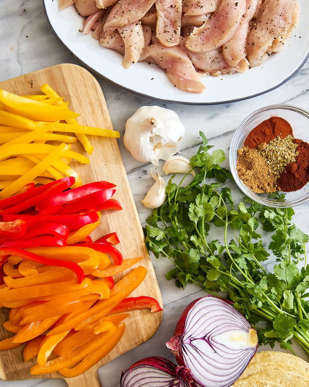 - Prep the chicken and vegetables. Place the sliced chicken, bell peppers, and red onion on a large sheet pan. Drizzle with olive oil and lime juice, then sprinkle the fajita seasoning over everything. Toss until evenly coated.