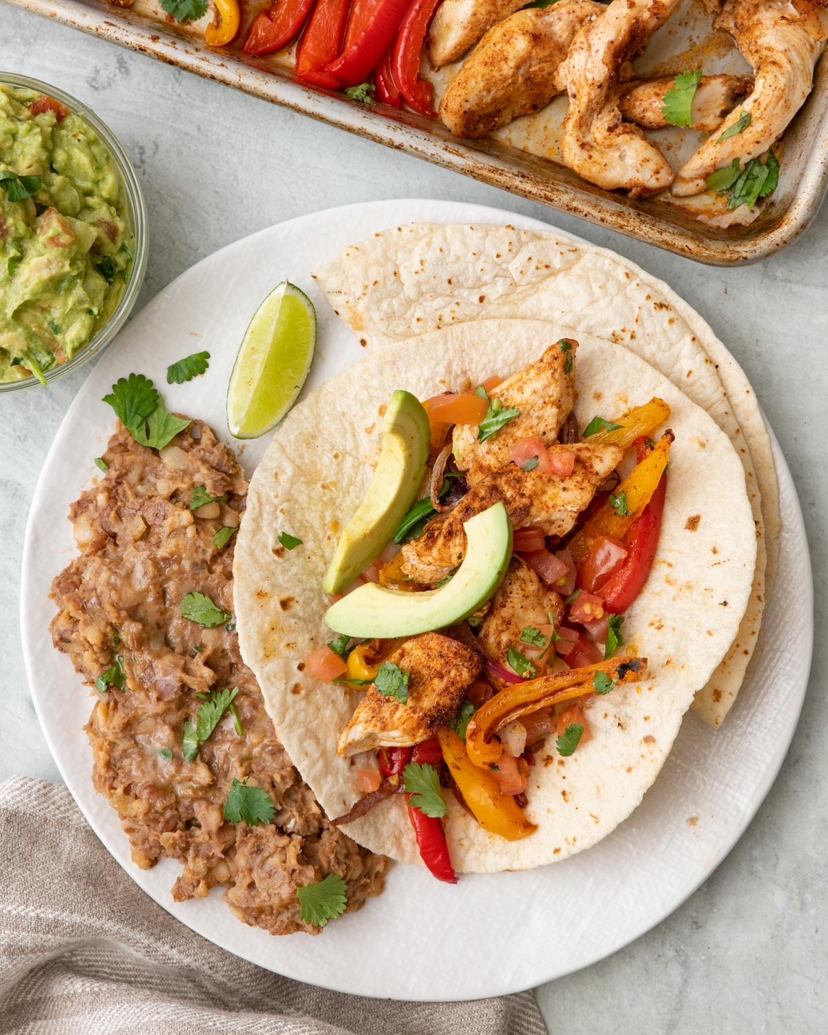 Fajitas are all about building your own, so I like to set up a little spread and let everyone customize their plate.