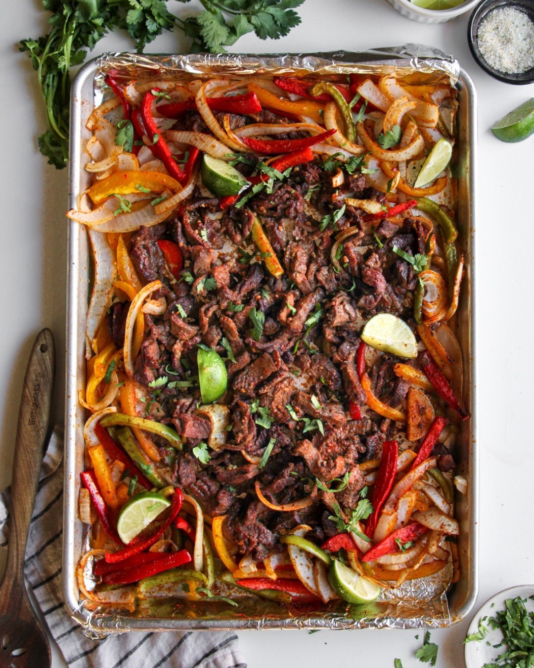 Shrimp fajitas: Large shrimp only need about 8–10 minutes in the oven. Toss them with the same seasoning and add them to the pan during the last 10 minutes of cooking so they don’t overcook.